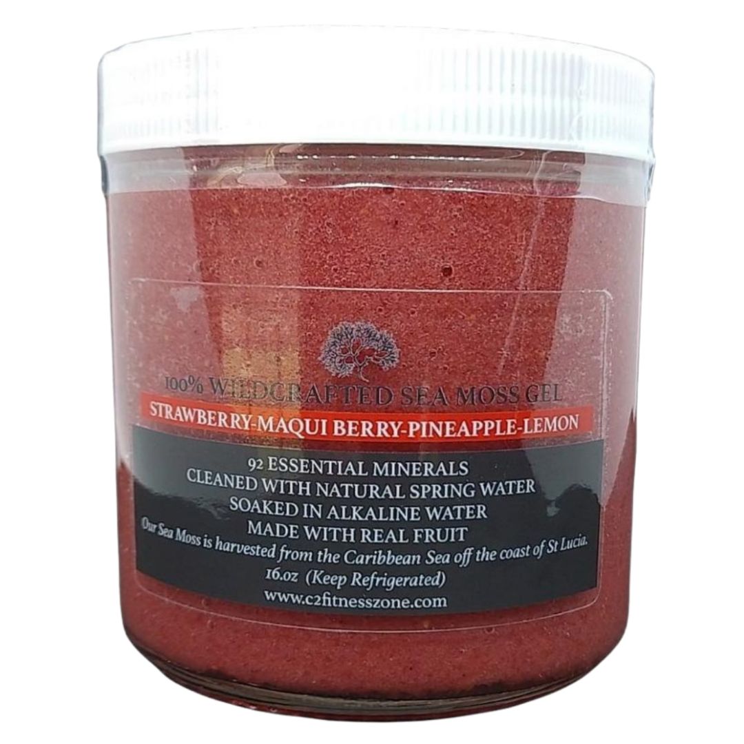 Wildcrafted Sea Moss, cleaned with 100% Natural Spring Water, soaked with Alkaline Water and Key Limes. Fresh Strawberries, Pineapples, and Lemon, + Maqui Berry Powder.